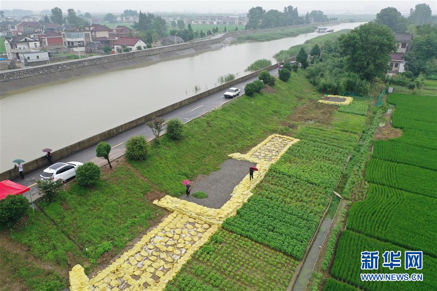 在鎮(zhèn)江市丹徒區(qū)世業(yè)鎮(zhèn)先鋒村西南大堤,中國安能集團第二工程局常州分公司防汛前置備勤隊員在用木樁固定捆好的蘆葦(7月17日攝,無人機照片)。捆蘆葦護邊坡、機器人進涵洞、“養(yǎng)水盆”防滲漏……在江蘇鎮(zhèn)江,當(dāng)?shù)馗刹咳罕姾蛯I(yè)力量,因地制宜就地取材,老辦法搭配新技術(shù),一批險情得以消除在萌芽狀態(tài)。新華社記者季春鵬攝