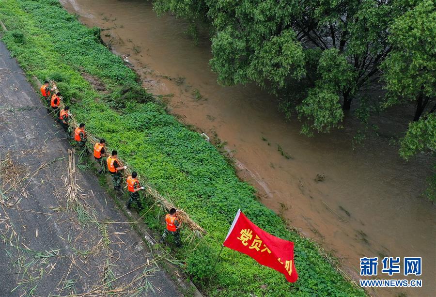 在鎮(zhèn)江市丹徒區(qū)世業(yè)鎮(zhèn)先鋒村西南大堤,中國安能集團第二工程局常州分公司防汛前置備勤隊員準(zhǔn)備將捆好的蘆葦放在江堤邊(7月17日攝,無人機照片)。捆蘆葦護邊坡、機器人進涵洞、“養(yǎng)水盆”防滲漏……在江蘇鎮(zhèn)江,當(dāng)?shù)馗刹咳罕姾蛯I(yè)力量,因地制宜就地取材,老辦法搭配新技術(shù),一批險情得以消除在萌芽狀態(tài)。新華社記者季春鵬攝