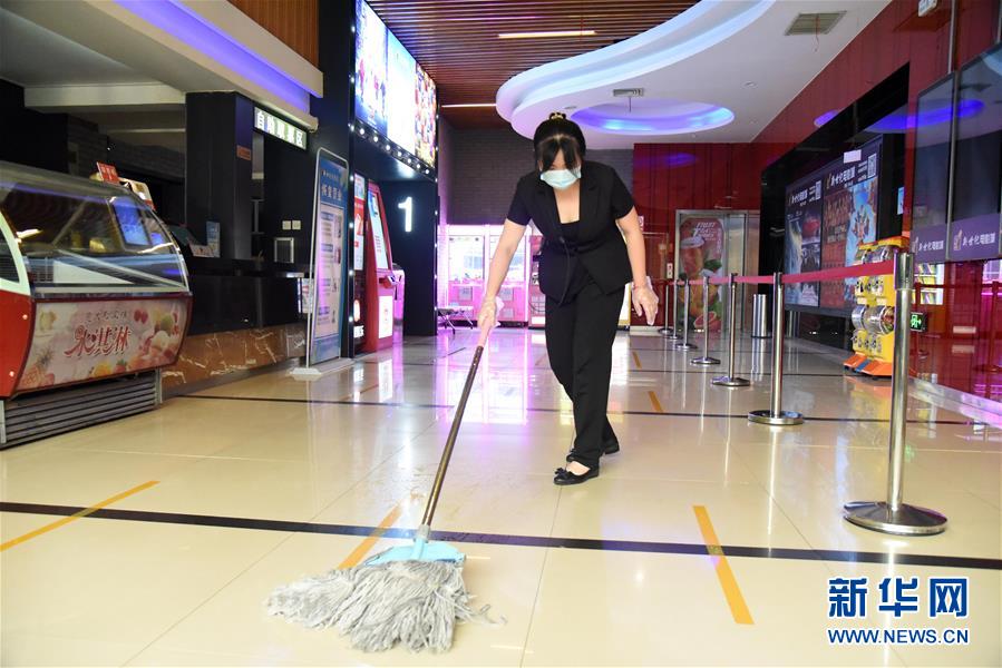 7月20日,濟(jì)南新世紀(jì)電影城陽(yáng)光100店的員工在對(duì)影院設(shè)施進(jìn)行消殺。當(dāng)日,山東濟(jì)南市部分電影院在嚴(yán)格防控疫情的基礎(chǔ)上陸續(xù)恢復(fù)開(kāi)放。新華社記者王凱攝