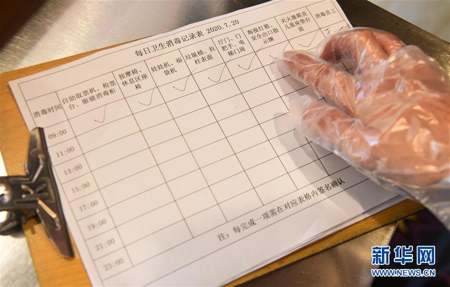 7月20日,濟(jì)南新世紀(jì)電影城陽(yáng)光100店的員工在展示消殺記錄。當(dāng)日,山東濟(jì)南市部分電影院在嚴(yán)格防控疫情的基礎(chǔ)上陸續(xù)恢復(fù)開(kāi)放。新華社記者王凱攝