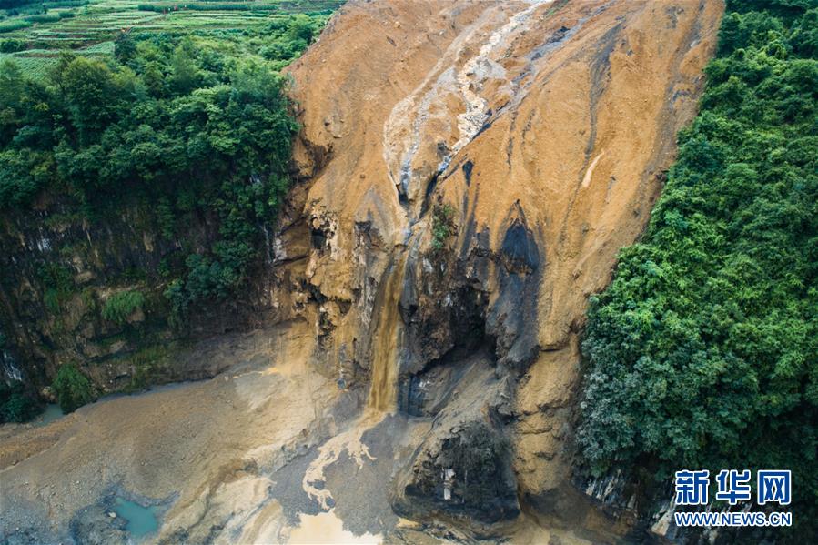 7月22日拍攝的因恩施州屯堡鄉(xiāng)馬者村山體滑坡形成的堰塞湖(無人機照片)。