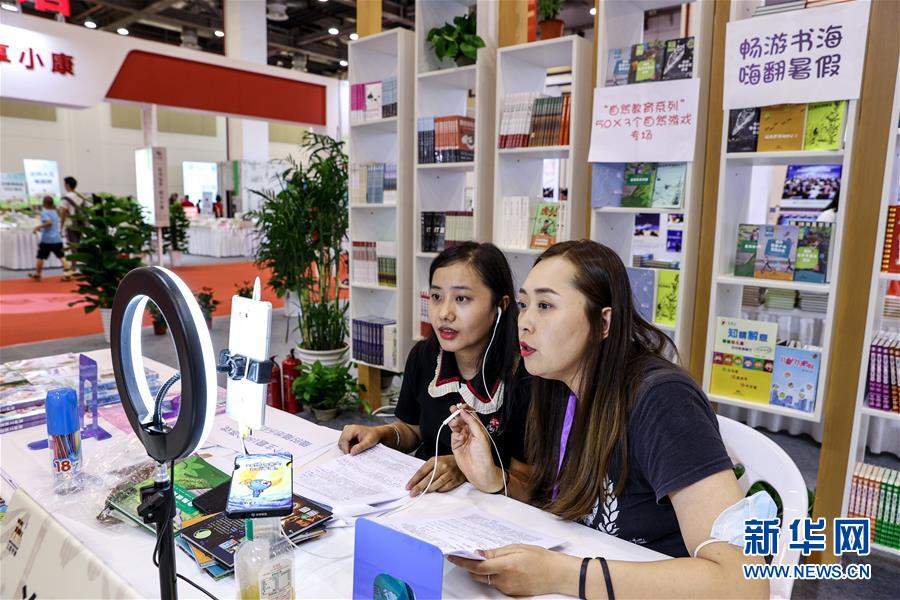 7月23日,兩位參展工作人員在網(wǎng)上直播介紹圖書。當(dāng)日,第十屆江蘇書展在江蘇蘇州開(kāi)幕,400多家出版發(fā)行單位參展,吸引眾多讀者選購(gòu)圖書。新華社記者楊磊攝