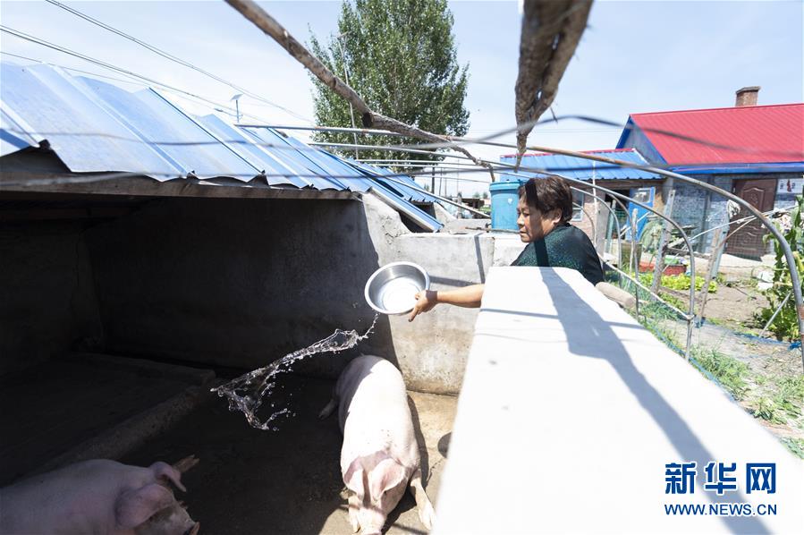 7月23日,在黑龍江省撫遠(yuǎn)市濃橋鎮(zhèn)東方紅村,康麗艷向豬圈中灑水降溫。新華社記者 謝劍飛 攝