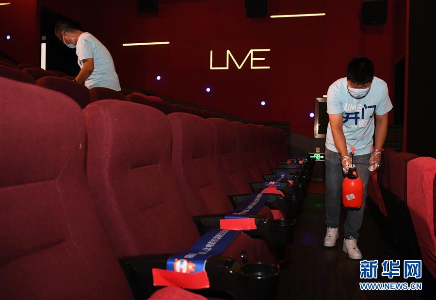 7月24日,在UME影城北京華星店1號(hào)影廳,工作人員進(jìn)行消殺清潔工作。當(dāng)日,在做好新冠肺炎疫情防控的前提下,北京市部分電影院有序恢復(fù)開(kāi)放。新華社記者 任超 攝