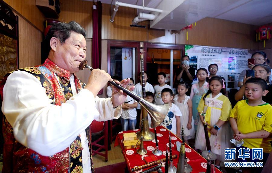 7月26日,在石家莊市橋西區(qū)休門街道休門西街社區(qū),休門吹歌傳承人付錫芬(左一)在傳授嗩吶吹奏技巧。當(dāng)日,河北省石家莊市橋西區(qū)暑期“非遺”小課堂開班。河北省級(jí)非物質(zhì)文化遺產(chǎn)休門吹歌傳承人走進(jìn)休門街道休門西街社區(qū),為轄區(qū)小朋友講解休門吹歌歷史,傳授非遺技藝,豐富他們的暑期生活。新華社記者 王曉 攝