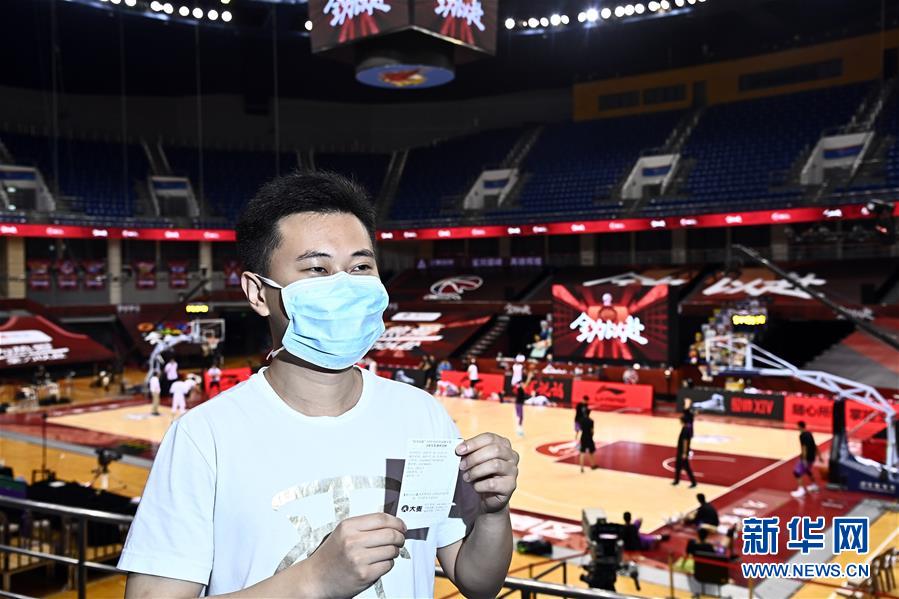 7月26日,在青島國信體育館,蘇柯帆展示著自己的紙質(zhì)球票。他成為CBA聯(lián)賽復(fù)賽允許觀眾現(xiàn)場觀賽后,首位進場的觀眾。當日,在山東青島舉行的2019-2020賽季中國男子籃球職業(yè)聯(lián)賽(CBA)復(fù)賽第二階段(嶗山賽區(qū))比賽中,醫(yī)護人員、教師、公安戰(zhàn)線人士通過官方購票平臺,完成包括核酸檢測在內(nèi)的相關(guān)流程后進場觀看了上海久事隊迎戰(zhàn)山東西王隊的比賽。觀賽期間,觀賽者須全程佩戴口罩,對號入座,嚴格保持間隔一米就座。退場時,觀眾須按照自后向前、先兩邊后中間的順序,保持“一米線”社交距離有序退場。新華社記者 郭緒雷 攝