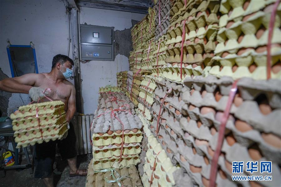 7月26日,在烏魯木齊新聯(lián)農(nóng)副產(chǎn)品綜合市場內(nèi),商販在擺放即將批發(fā)的雞蛋。新華社記者 趙戈 攝