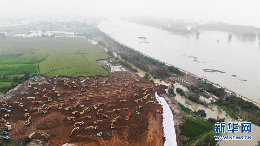 7月28日,在姜唐湖蓄洪區(qū)戴家湖一處涵閘險(xiǎn)情處置現(xiàn)場(chǎng),人們操作機(jī)械設(shè)備在搶筑臨時(shí)圩堤(無(wú)人機(jī)照片)。新華社記者張端攝