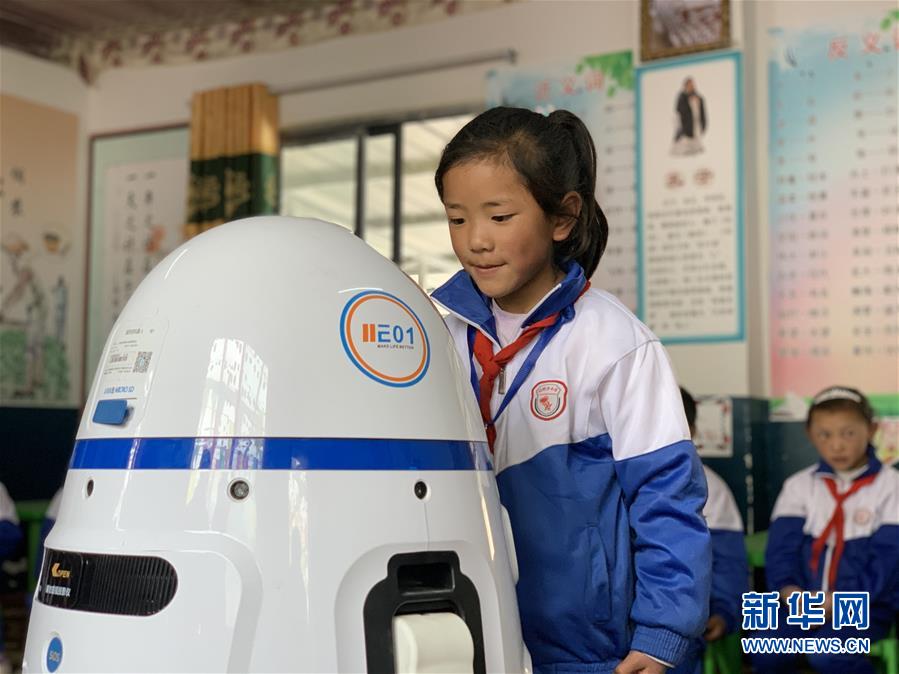 拉孜鄉(xiāng)中心小學(xué)學(xué)生在與智能機(jī)器人對話(7月29日攝)。新華社記者洛卓嘉措攝