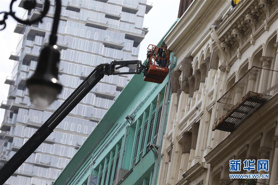 7月30日,在美國紐約蘇豪商業(yè)區(qū),工人在一棟建筑外作業(yè)。美國商務部30日公布的首次預估數(shù)據(jù)顯示,受新冠疫情導致經(jīng)濟大面積“停擺”和消費停滯拖累,今年第二季度美國實際國內(nèi)生產(chǎn)總值(GDP)按年率計算下滑32.9%,創(chuàng)1947年有記錄以來最大降幅。新華社記者王迎攝