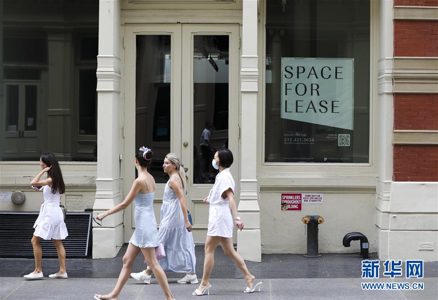 7月30日,在美國紐約蘇豪商業(yè)區(qū),人們從一家招租的店面旁走過。美國商務部30日公布的首次預估數(shù)據(jù)顯示,受新冠疫情導致經(jīng)濟大面積“停擺”和消費停滯拖累,今年第二季度美國實際國內(nèi)生產(chǎn)總值(GDP)按年率計算下滑32.9%,創(chuàng)1947年有記錄以來最大降幅。新華社記者王迎攝