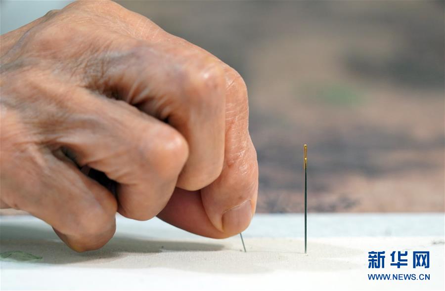 在開封市素花宋繡工藝有限公司的展示館里,王素花在刺繡(7月30日攝)。新華社記者李嘉南攝