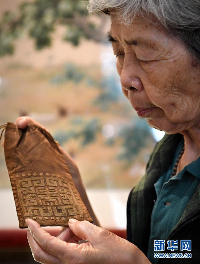 在開封市素花宋繡工藝有限公司的展示館里,王素花在看自己收集的老繡品(7月30日攝)。新華社記者李安攝