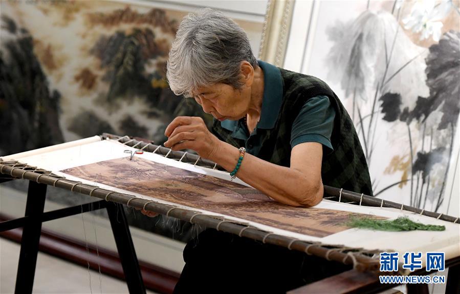 在開封市素花宋繡工藝有限公司的展示館里,王素花在刺繡(7月30日攝)。新華社記者李安攝