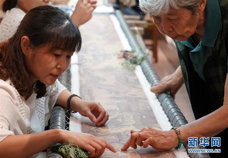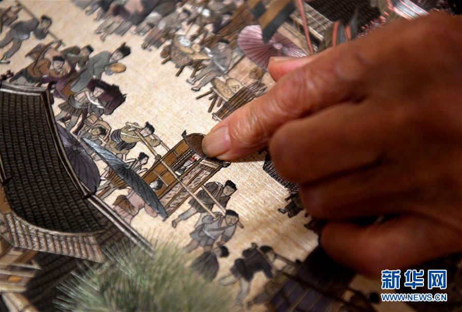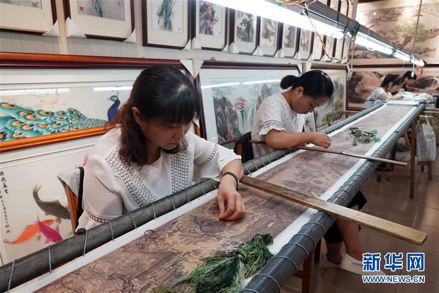 這是王素花和徒弟們新近繡制的《清明上河圖》局部(7月30日攝)。新華社記者李嘉南攝