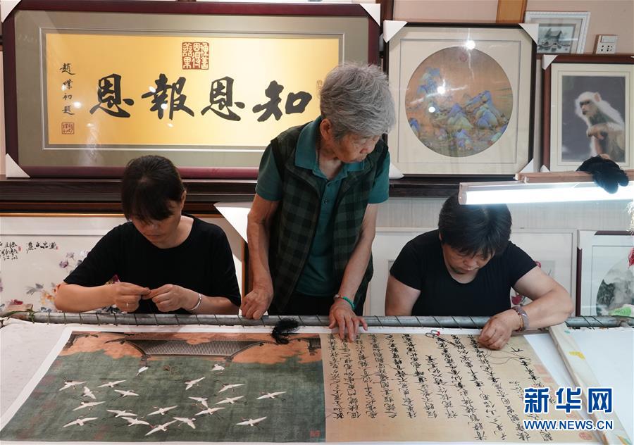 在開封市素花宋繡工藝有限公司的展示館里,王素花的徒弟們在刺繡(7月30日攝)。新華社記者李嘉南攝