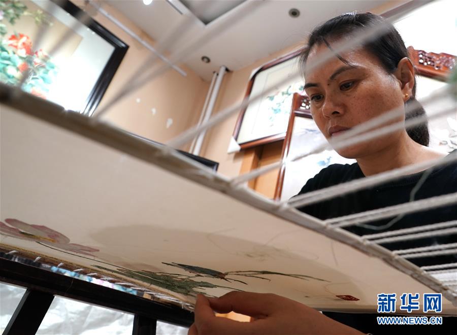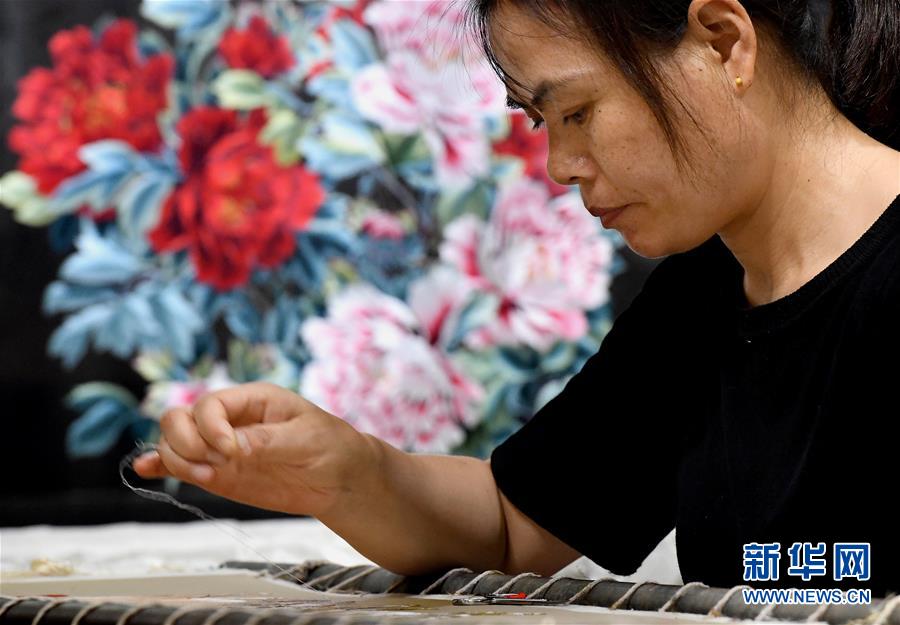 在開封市素花宋繡工藝有限公司的展示館里,王素花的徒弟劉冬紅在刺繡(7月30日攝)。新華社記者李嘉南攝