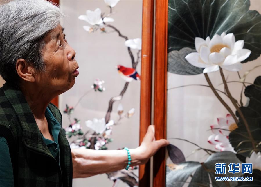 在開封市素花宋繡工藝有限公司的展示館里,王素花在觀看自己的刺繡作品(7月30日攝)。新華社記者李嘉南攝