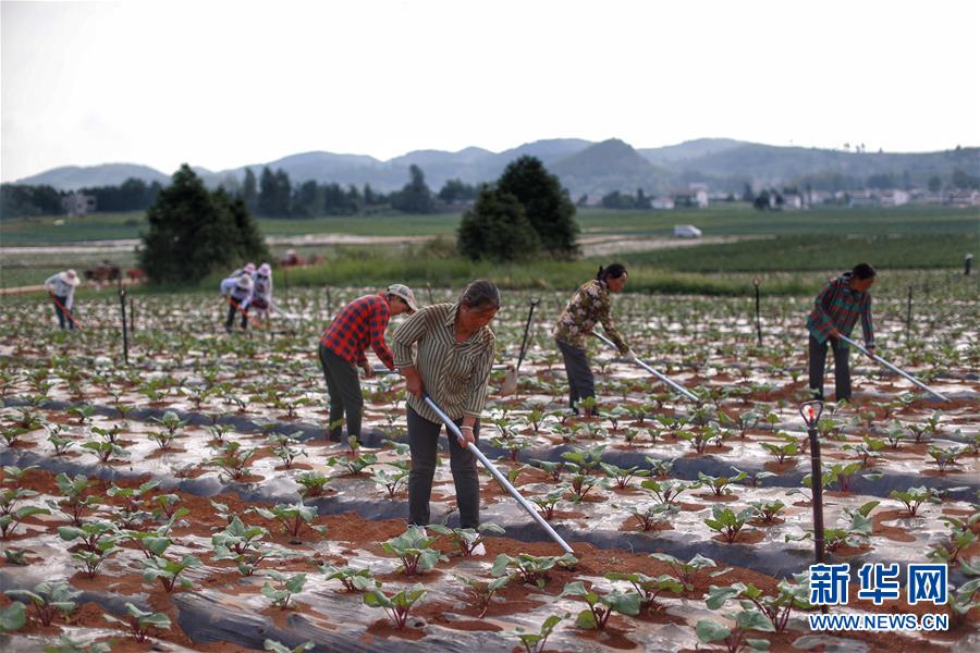 8月6日,村民在威寧縣草海鎮(zhèn)中海社區(qū)蔬菜基地種植西蘭花。新華社記者劉續(xù)攝
