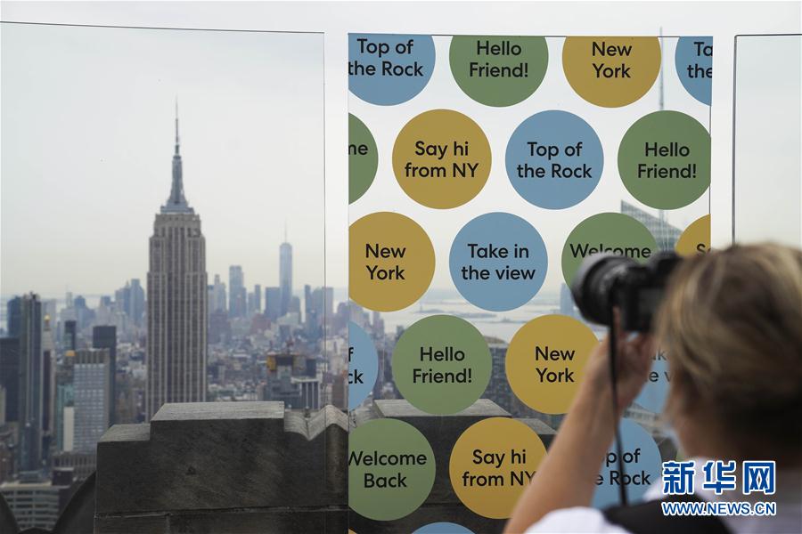 8月6日,在美國紐約,一名攝影師在洛克菲勒中心觀景臺上拍攝城市景觀。當日,3月份暫時關閉的洛克菲勒中心觀景臺恢復對公眾開放。每天13時至21時,人們可戴口罩前往參觀。新華社記者王迎攝