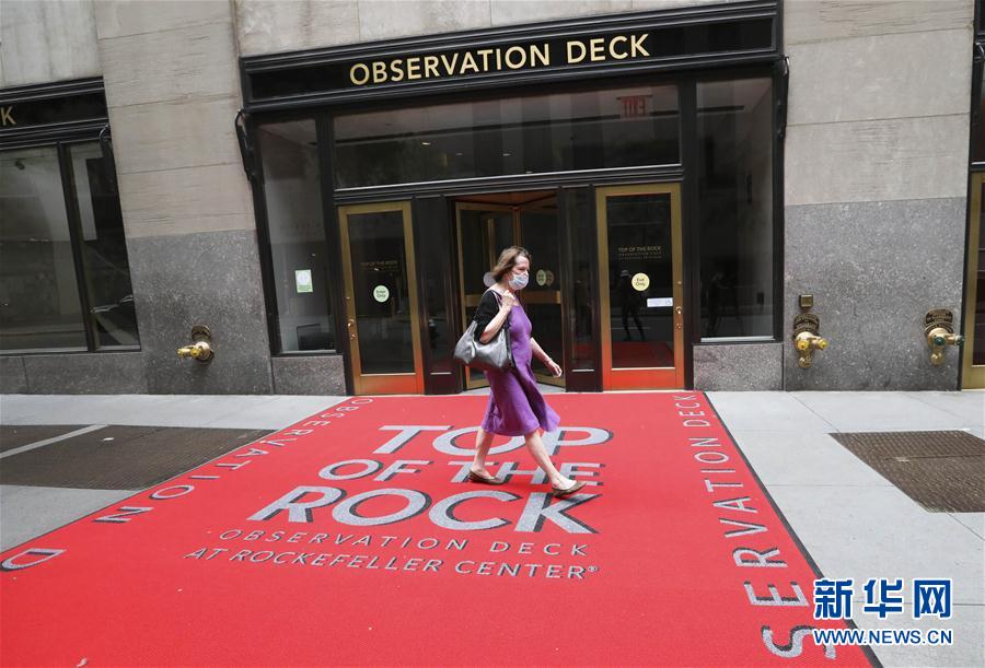 8月6日,在美國(guó)紐約,一名女子從洛克菲勒中心觀景臺(tái)的入口走過(guò)。當(dāng)日,3月份暫時(shí)關(guān)閉的洛克菲勒中心觀景臺(tái)恢復(fù)對(duì)公眾開(kāi)放。每天13時(shí)至21時(shí),人們可戴口罩前往參觀。新華社記者王迎攝