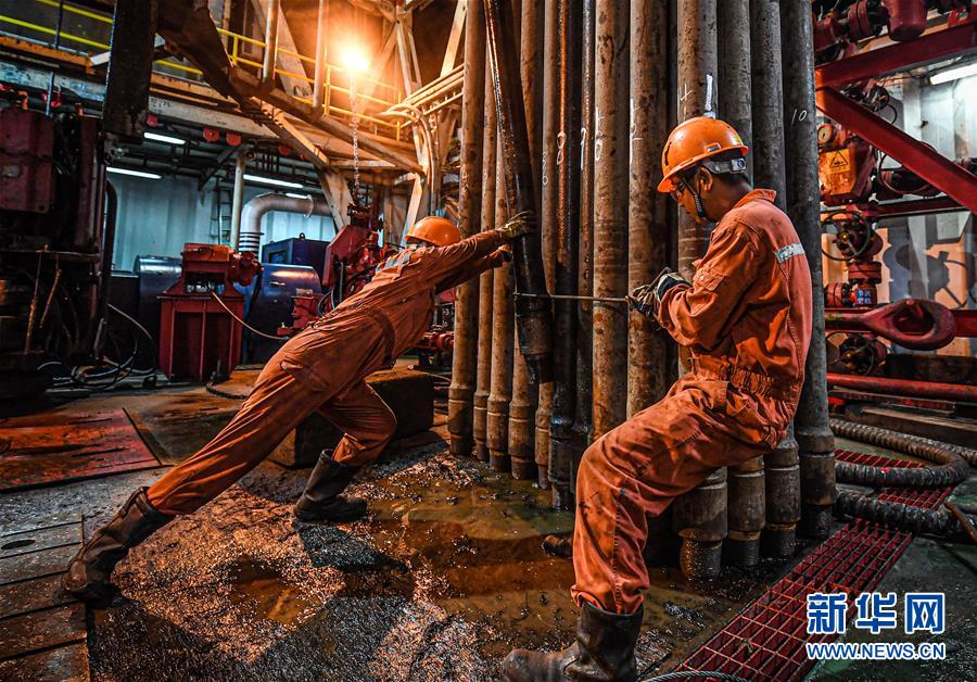 7月26日,在位于南海北部海域的勘探三號鉆井平臺上,鉆井工人在擺放鉆桿。新華社記者蒲曉旭攝