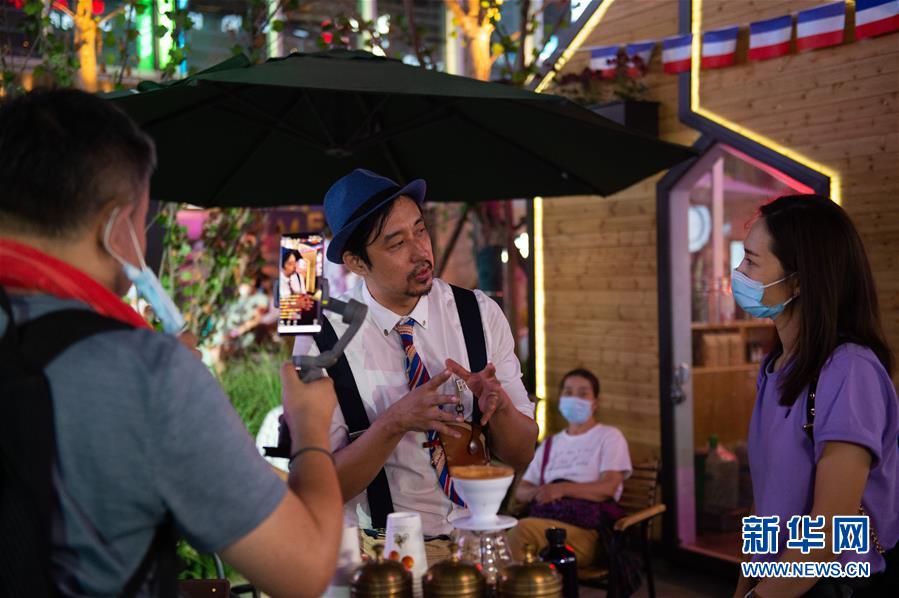 8月8日晚,望京小街商業(yè)街上一家咖啡店的工作人員(中)在接受網(wǎng)絡(luò)直播采訪。新華社記者 陳鐘昊 攝