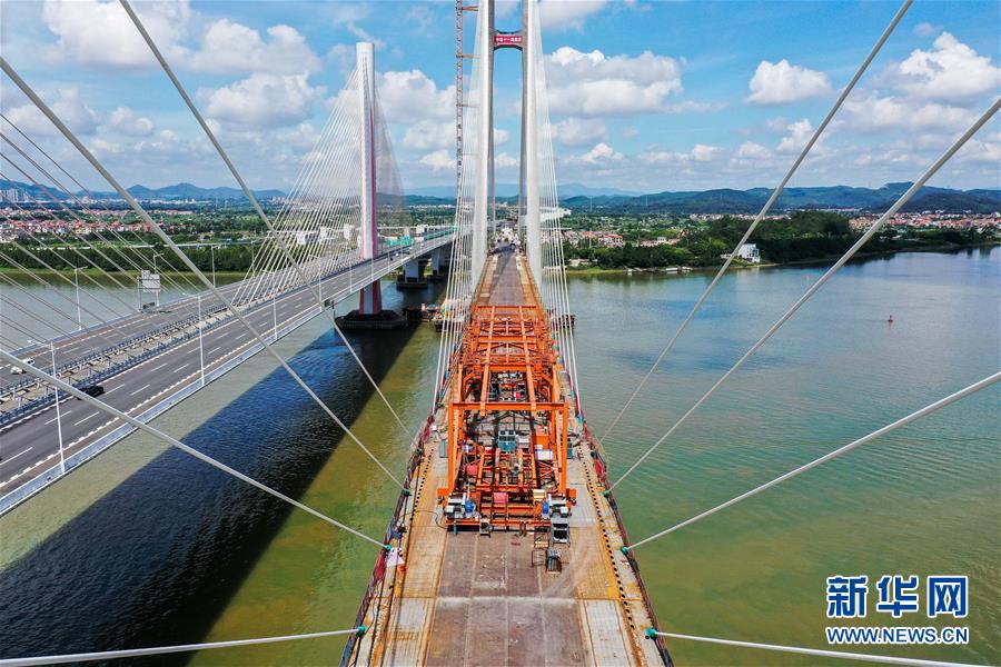 8月9日拍攝的廣州南沙港鐵路跨西江特大斜拉橋最后一塊鋼箱梁吊裝施工現(xiàn)場(chǎng)(無人機(jī)照片)。當(dāng)日,中鐵十一局承建的粵港澳大灣區(qū)基礎(chǔ)設(shè)施“硬聯(lián)通”重點(diǎn)工程——廣州南沙港鐵路跨西江特大斜拉橋完成最后一塊鋼箱梁吊裝作業(yè),大橋即將合龍。該橋位于廣東佛山市和江門市交界處,全長(zhǎng)1117.5米。新華社記者劉大偉攝。