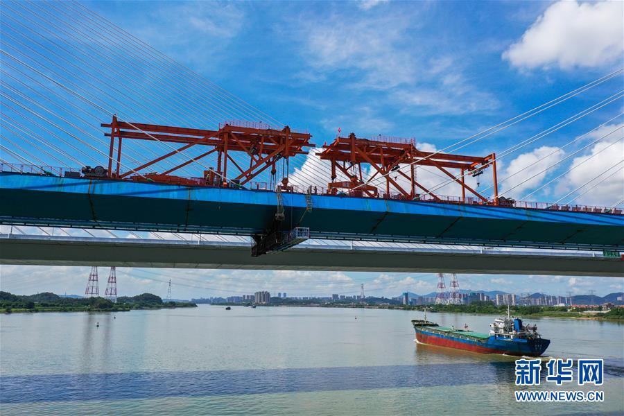 8月9日拍攝的廣州南沙港鐵路跨西江特大斜拉橋最后一塊鋼箱梁吊裝施工現(xiàn)場(chǎng)(無(wú)人機(jī)照片)。當(dāng)日,中鐵十一局承建的粵港澳大灣區(qū)基礎(chǔ)設(shè)施“硬聯(lián)通”重點(diǎn)工程——廣州南沙港鐵路跨西江特大斜拉橋完成最后一塊鋼箱梁吊裝作業(yè),大橋即將合龍。該橋位于廣東佛山市和江門市交界處,全長(zhǎng)1117.5米。新華社記者劉大偉攝。