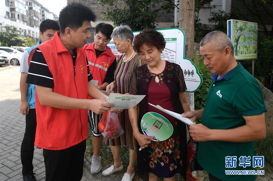 8月9日,湖州市吳興區(qū)八里店鎮(zhèn)志愿者(左)在百合苑小區(qū)向居民介紹生活垃圾定點投放的注意事項。近年來,浙江省通過創(chuàng)新宣傳教育,多措并舉促進垃圾分類投放、收運及處置的良性循環(huán),引領(lǐng)垃圾分類成為城鄉(xiāng)居民的生活新風(fēng)尚。新華社記者黃宗治攝。
