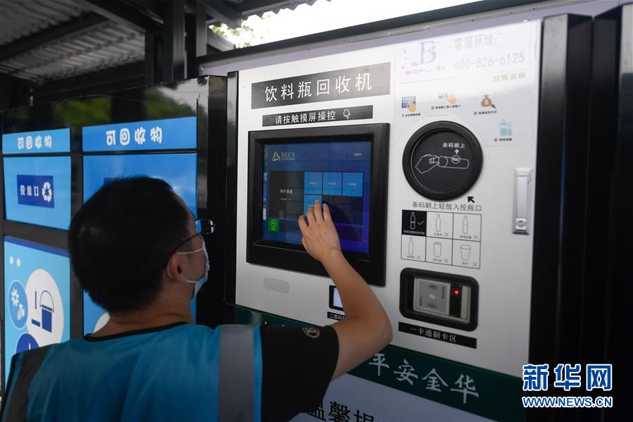 網(wǎng)格員在金華市金東區(qū)東孝街道一處垃圾分類投放點操作飲料瓶回收機(7月16日攝)。近年來,浙江省通過創(chuàng)新宣傳教育,多措并舉促進垃圾分類投放、收運及處置的良性循環(huán),引領(lǐng)垃圾分類成為城鄉(xiāng)居民的生活新風(fēng)尚。新華社記者黃宗治攝。