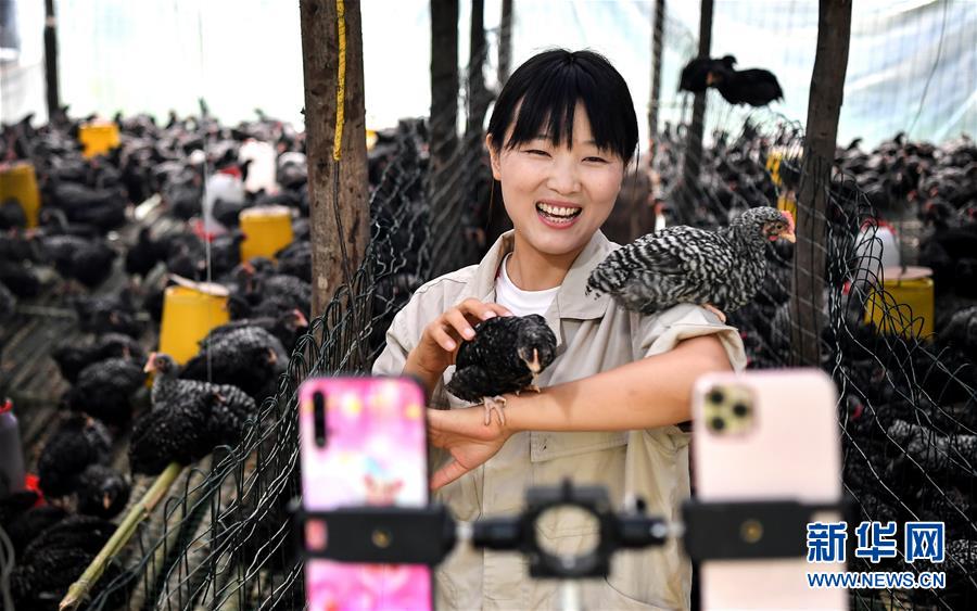 陜西商洛市丹鳳縣寺坪鎮(zhèn)寺坪村的網(wǎng)絡(luò)主播李萌在直播介紹自家養(yǎng)的蘆花雞(7月20日攝)。陜西丹鳳縣位于秦嶺東段南麓,依山傍水、農(nóng)特產(chǎn)品豐富。近年來,隨著網(wǎng)絡(luò)銷售模式的興起,當(dāng)?shù)胤e極培育壯大“本土網(wǎng)紅”隊伍,通過網(wǎng)絡(luò)直播、線上銷售、線下配送等形式,助力秦嶺山區(qū)優(yōu)質(zhì)農(nóng)產(chǎn)品走出大山,帶動百姓增收致富。新華社記者劉瀟攝。
