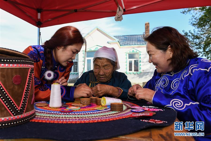在內(nèi)蒙古自治區(qū)鄂溫克族自治旗伊敏蘇木的老家,艾吉瑪(左)在向姥姥水機花(中)、母親烏仁(右)學習太陽花制作工藝。(8月6日攝)。新華社記者劉磊攝。