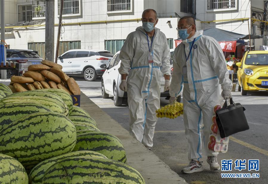 8月12日,烏魯木齊市天山區(qū)山西巷社區(qū)工作人員王志鷹(右)在社區(qū)物資保障點(diǎn)前詢問水果銷售情況。新華社記者 高晗攝