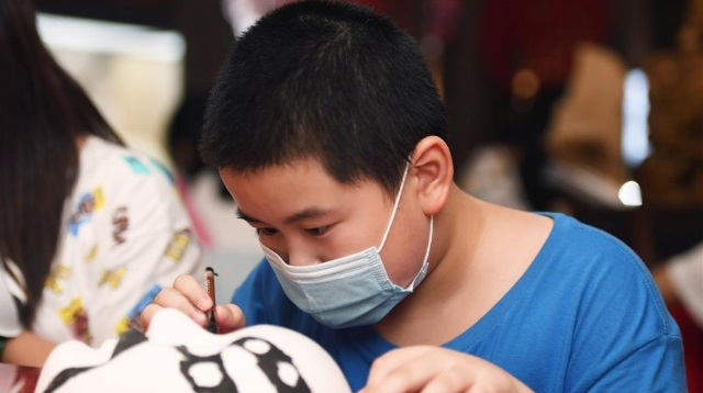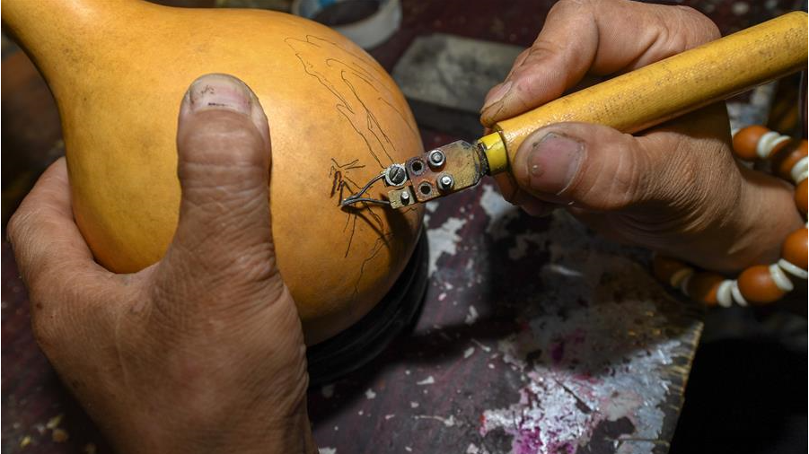 8月5日,侯景偉在葫蘆上進(jìn)行創(chuàng)作。經(jīng)過多年潛心研究,他將浮雕和烙畫工藝相結(jié)合,通過拋光、起稿、雕刻、烙燙、套色等十余道工藝,制作展現(xiàn)傳統(tǒng)文化、民俗故事的葫蘆工藝品。