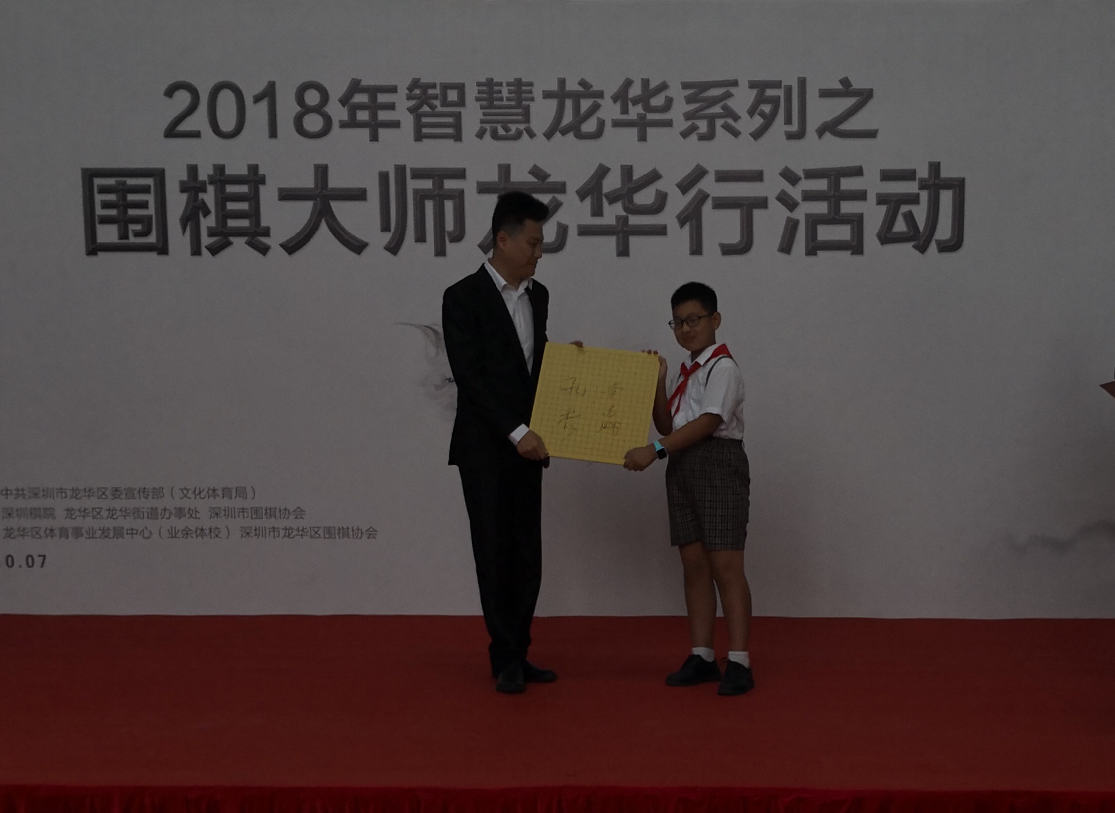開幕式上,龍華區(qū)委副書記苗寧禮,龍華區(qū)委常委、宣傳部長黃啟鍵及區(qū)文化體育局相關(guān)負(fù)責(zé)人等在百忙中前來為“智慧龍華”捧場加油?;顒釉谳p松熱鬧的歌舞中拉開帷幕,文化體育局負(fù)責(zé)人在致辭中對諸位圍棋大師的到來表示熱烈的歡迎,對活動擴大中華圍棋文化的傳播,推動龍華區(qū)圍棋的發(fā)展給予了充分的肯定。隨后,黃啟健常委代表龍華區(qū)聘請李昌鎬大師擔(dān)任龍華區(qū)圍棋發(fā)展的名譽顧問并頒發(fā)了證書,李昌鎬則回贈了簽名棋盤。緊接著,孔杰老師也給參加活動的小棋手贈予了簽名棋盤。在廣東圍棋總冠軍佟云老師簡要介紹李昌鎬、孔杰的精采圍棋經(jīng)歷之后,活動主持人還現(xiàn)場采訪了李昌鎬、孔杰,就兩人圍棋從業(yè)過程中的難記經(jīng)歷、精采賽事以及對人工智能圍的展望等進行了提問,兩位大師的回答坦率、誠懇,贏得了現(xiàn)場觀眾的陣陣掌聲?;顒拥母叱笔抢畈€、孔杰、車澤武、張亞博四位老師與龍華區(qū)的圍棋愛好者進行多面打的活動,梁偉棠九段和徐瑩老師還進行掛盤講解。