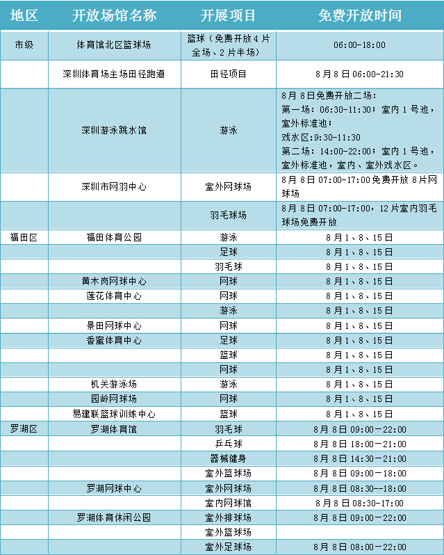 在“全民健身日”期間,深圳舉辦“全民健身嘉年華”及各類市級健身賽事活動16場,各區(qū)、各相關(guān)單位也結(jié)合實際,組織推出80余場全民健身運動,如面向全市市民的大型國民體質(zhì)監(jiān)測和健身咨詢活動、全民健身大講堂活動等。各級社會體育指導員也將開展義務(wù)健身輔導,利用豐富的體育專業(yè)技能,向廣大群眾講解健身知識,推廣健身方法,普及科學健身理念,為全民健身活動提供技術(shù)指導服務(wù)。8月8日“全民健身日”當天,深圳市體育中心以及各區(qū)體育場館,也將免費向市民或單位開放。