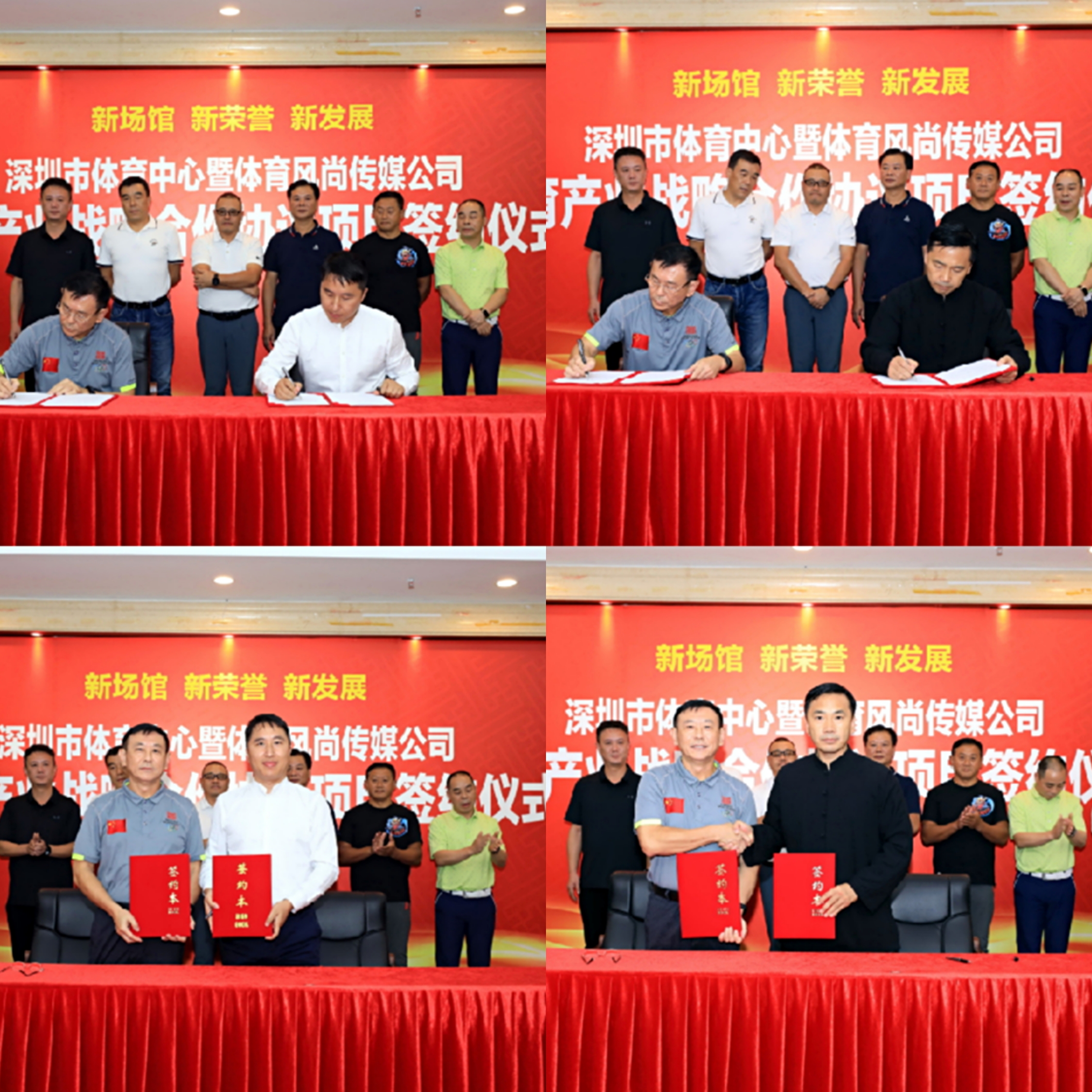 深圳體育風(fēng)尚傳媒發(fā)展有限公司代表深圳市體育中心與深圳最具規(guī)模的賽事承辦公司之一——深圳市五環(huán)體育產(chǎn)業(yè)發(fā)展集團(tuán)、深圳體育會(huì)展龍頭企業(yè)——深圳國際體育博覽會(huì)有限公司、擁有自有國內(nèi)最具規(guī)模的業(yè)余帆船賽事的深圳市帆海匯俱樂部投資發(fā)展有限公司、中國太極拳運(yùn)動(dòng)權(quán)威機(jī)構(gòu)——深圳市弘武太極拳研究院四家深圳本土體育產(chǎn)業(yè)知名機(jī)構(gòu)代表簽訂了多項(xiàng)體育產(chǎn)業(yè)戰(zhàn)略協(xié)議,并與各方就體育中心未來體育產(chǎn)業(yè)發(fā)展方向及行業(yè)資源的引進(jìn)與落地進(jìn)行了深度探討。