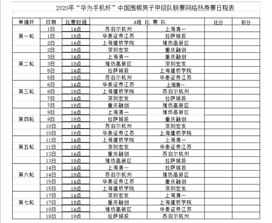 附2:2020年“華為手機杯”中國圍棋男子甲級隊聯(lián)賽網(wǎng)絡熱身賽AB兩組日程表