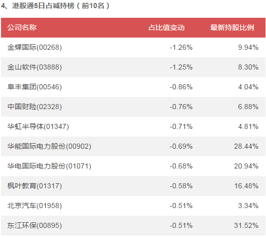 在最近5個(gè)交易日內(nèi),晨鳴紙業(yè)(01812)、長(zhǎng)城汽車(02333)、山東新華製藥股份(00719)港股通持股占比增加值最大,分別增加5.17%、0.82%、0.62%;金蝶國(guó)際(00268)、金山軟件(03888)、阜豐集團(tuán)(00546)港股通持股占比減少值最大,分別減少-1.26%、-1.25%、-0.86%。