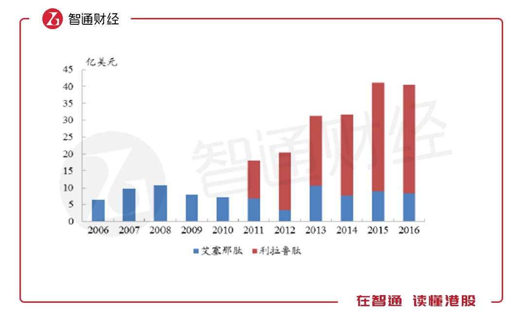 從2005年發(fā)展至今,全球已有6種GLP-1受體激動劑相繼獲批上市,整個GLP-1受體激動劑類藥物的全球市場規(guī)模已超過40億美元,2011-2016年的復合增長率超過15%。而艾塞那肽作為最早上市的GLP-1類似物,上市后銷售額快速增長,早在2008年就突破10億美元。