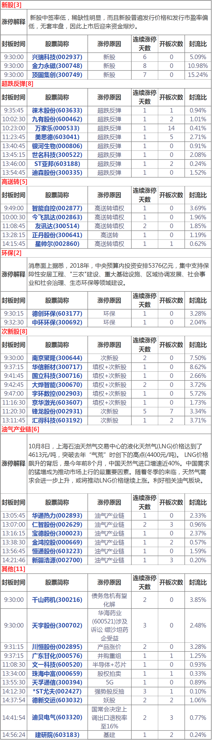 漲停分析:油氣概念強者恒強次新股多股漲停(10月10日)