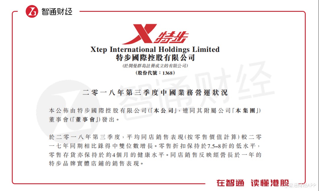 智通財(cái)經(jīng)APP根據(jù)公開資料整理發(fā)現(xiàn),特步過往季度的同店銷售增長水平時常保持在中單位數(shù)甚至低單位數(shù)的增長水平,直到2018年一季度才實(shí)現(xiàn)低雙位數(shù)增長,這也是公司自2013年一季度開始披露這一數(shù)據(jù)以來,首次達(dá)到雙位數(shù)增長。