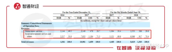 可見(jiàn),騰訊音樂(lè)旗下4款產(chǎn)品中有3款產(chǎn)品是通過(guò)帶有社交屬性的互動(dòng)打賞進(jìn)行變現(xiàn),這也就不難理解為何2017年該分部業(yè)務(wù)的收入占比達(dá)到70%。