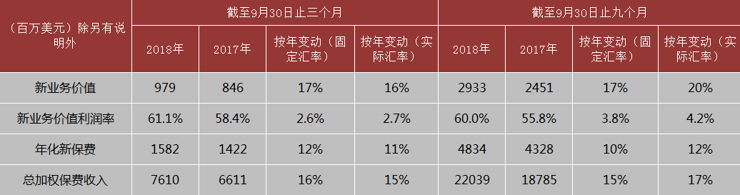 11月9日,友邦保險(xiǎn)控股有限公司(1299)公布截至2018年9月30日止第三財(cái)季業(yè)績(jī)顯示,報(bào)告期內(nèi),按固定匯率計(jì)算,公司新業(yè)務(wù)價(jià)值增長(zhǎng)17%至9.79億美元,年化新保費(fèi)上升12%至15.82億美元,新業(yè)務(wù)價(jià)值利潤(rùn)率增加2.6個(gè)百分點(diǎn)至61.1%,總加權(quán)保費(fèi)收入上升16%至76.10億美元。