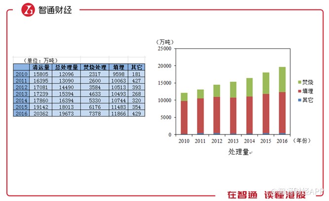智通財經(jīng)APP統(tǒng)計到,2010至2016年,生活垃圾清運量和處理量由15805、12096萬噸增長至20362、19673萬噸,無害化處理率由76.5%增至96.6%,可見垃圾處理率得到了明顯提高。