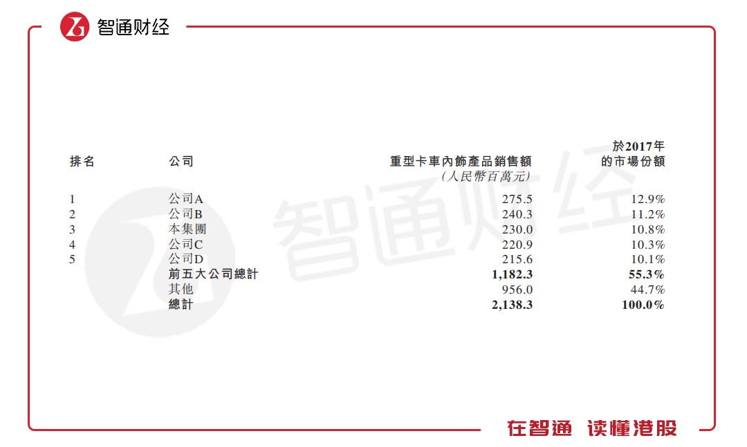 根據(jù)弗若斯特沙利文報(bào)告,按重型卡車內(nèi)飾產(chǎn)品的銷售額計(jì),公司是中國(guó)西北最大的重型卡車內(nèi)飾產(chǎn)品制造商(2017年市場(chǎng)份額達(dá)62.7%)及中國(guó)的第三大制造商(2017年市場(chǎng)份額達(dá)10.8%);按汽車內(nèi)飾產(chǎn)品的銷售額計(jì),公司是中國(guó)西北第二大汽車內(nèi)飾產(chǎn)品制造商(2017年市場(chǎng)份額達(dá)15.6%)及中國(guó)第十四大制造商(2017年市場(chǎng)份額達(dá)0.4%)。