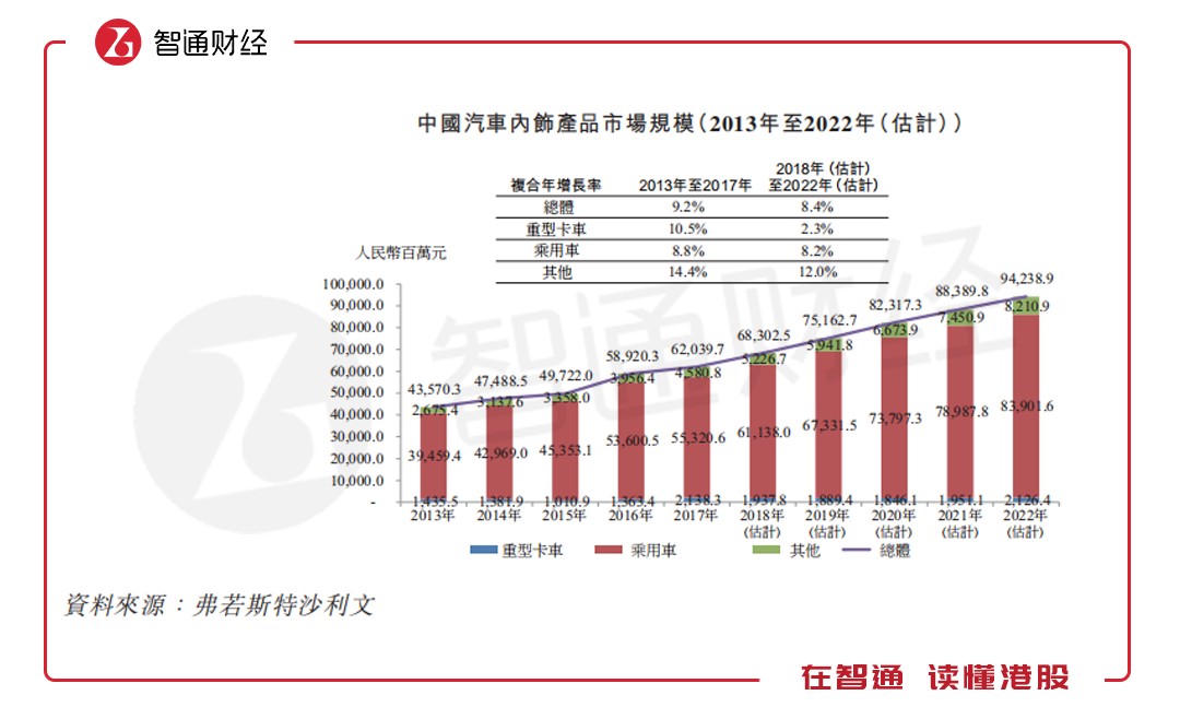智通財(cái)經(jīng)APP進(jìn)一步查閱天瑞招股說(shuō)明書發(fā)現(xiàn),從行業(yè)來(lái)看中國(guó)汽車內(nèi)飾產(chǎn)品市場(chǎng)的總值由2013年的435.7億元增至2017年的620.4億元,復(fù)合年增長(zhǎng)率為9.2%。估計(jì)市場(chǎng)規(guī)模將于2022年達(dá)到942.39億元,2018年至2022年期間的復(fù)合年增長(zhǎng)率為8.4%。