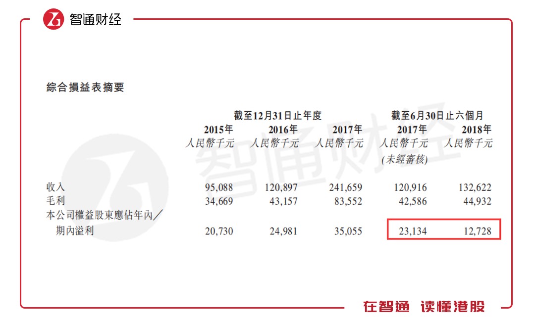 業(yè)績(jī)方面,招股書顯示,公司2015-2017年的收入分別約為9510萬(wàn)元(人民幣,下同)、1.21億元及2.42億元,同期公司凈利潤(rùn)分別約為2070萬(wàn)元、2500萬(wàn)元及3506萬(wàn)元。2018年上半年,公司收入為1.33億,同比增長(zhǎng)10%,凈利潤(rùn)為1273萬(wàn),同比下降45%。凈利率由于2017年上半年的14.5%,降低至9.6%。