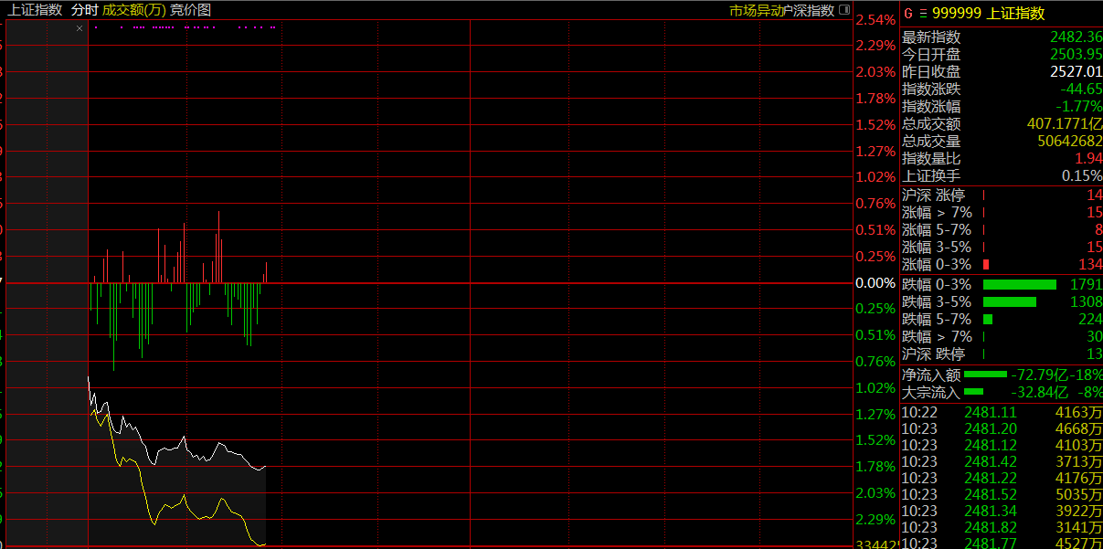 受美股加速下跌影響,12月25日,兩市大幅低開,滬指開盤報(bào)2503.95點(diǎn),跌0.91%。深成指開盤報(bào)7308.61點(diǎn),跌1.14%。創(chuàng)業(yè)板開盤報(bào)1269.14點(diǎn),跌1.18%。
